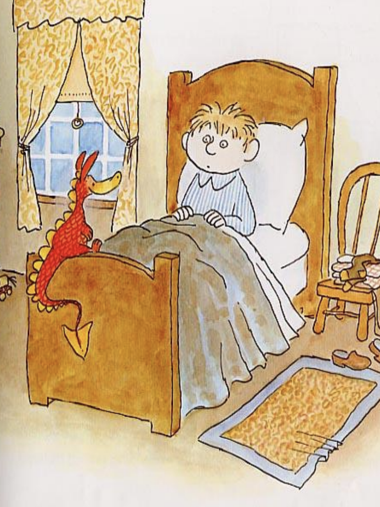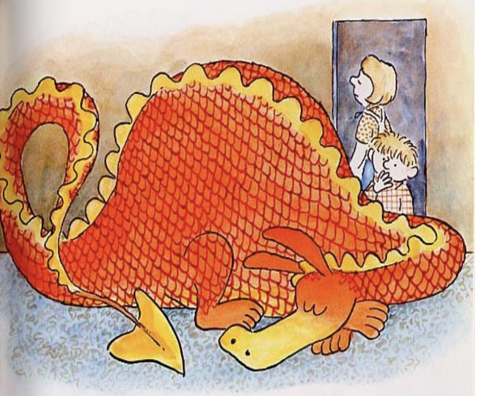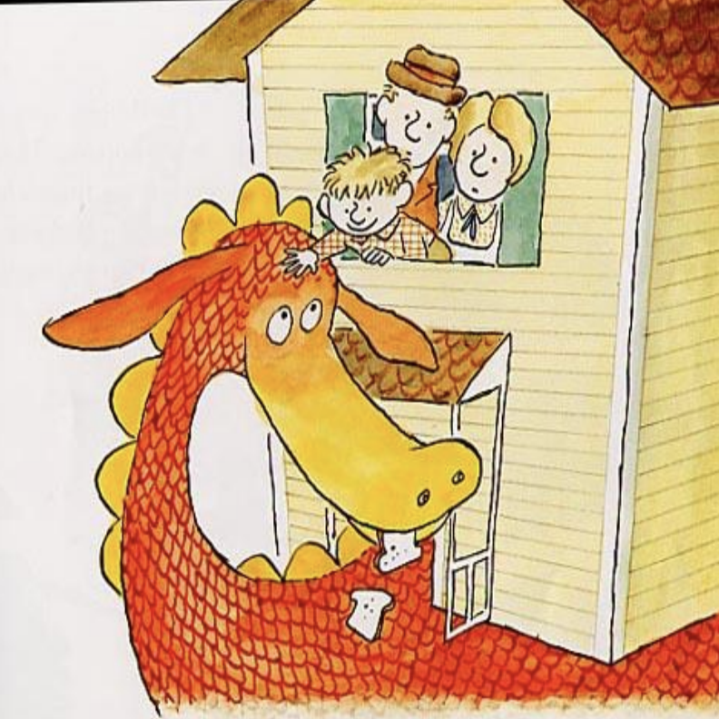 Finita colazione, Billy andò a lavarsi i denti. Il drago, che aveva ormai raggiunto la grandezza di un umano, si mise comodo e si addormentò. Quando Billy tornò giù, il drago riempiva ormai tutto l’ingresso e Billy dovette girargli intorno e passare per la sala per tornare da sua mamma. “Non sapevo che i draghi crescessero così velocemente” disse Billy. “Billy, non esistono i draghi!” disse ancora la madre. A mezzogiorno, il drago ormai era diventato talmente grande che occupava tutta la casa. La sua testa usciva addirittura dalla porta d’ingresso. Non c’era una stanza della casa che il drago non stesse occupando.